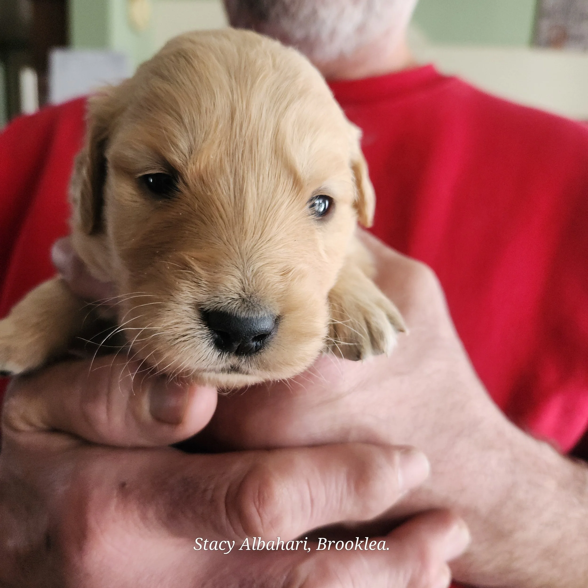 F1 means First Generation which is a direct cross between the Golden Retriever and Poodle. In our case for most of these pairings we use a Standard/Moyen Poodle giving us a medium sized puppy. Our F1 Mediums are typically 22-33" at the withers; our medium F1's are typically between 45 and 75 lbs full grown, some of our girls will produce smaller sized pups when full grown and some larger.